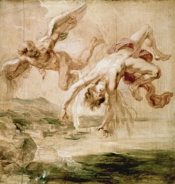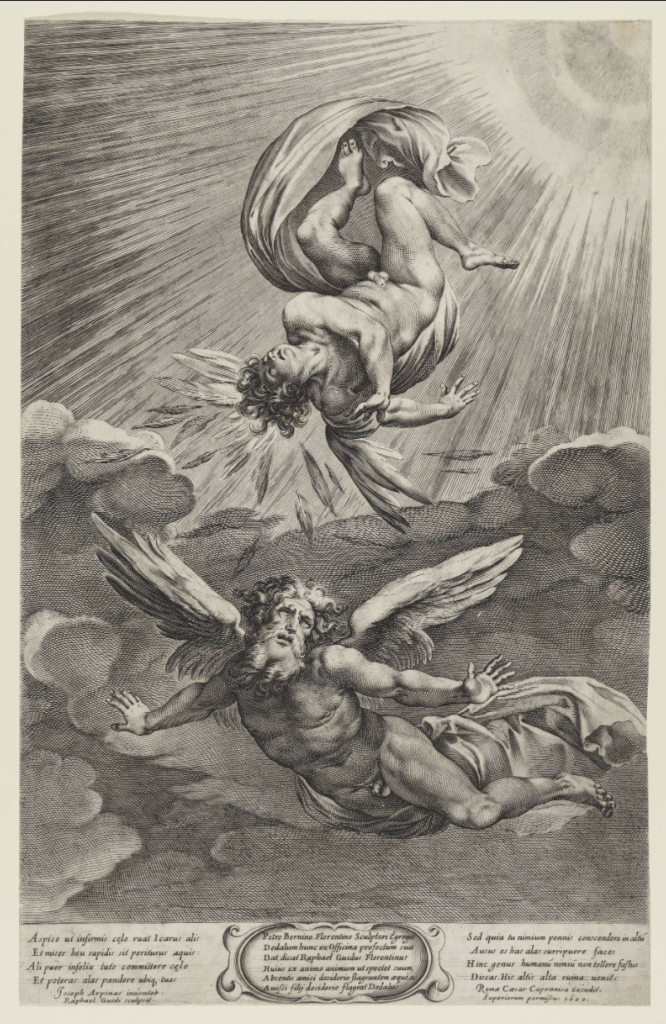 Classically, Icarus is shown as a fallen angel, muscled body in freefall. The focus is on his flight, not his face.