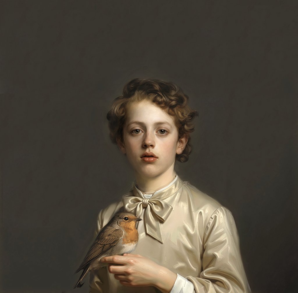 I imagine Icarus as a child, dreaming of adventure. A double portrait of a boy and a bird. A moment of stillness, calm before storm.