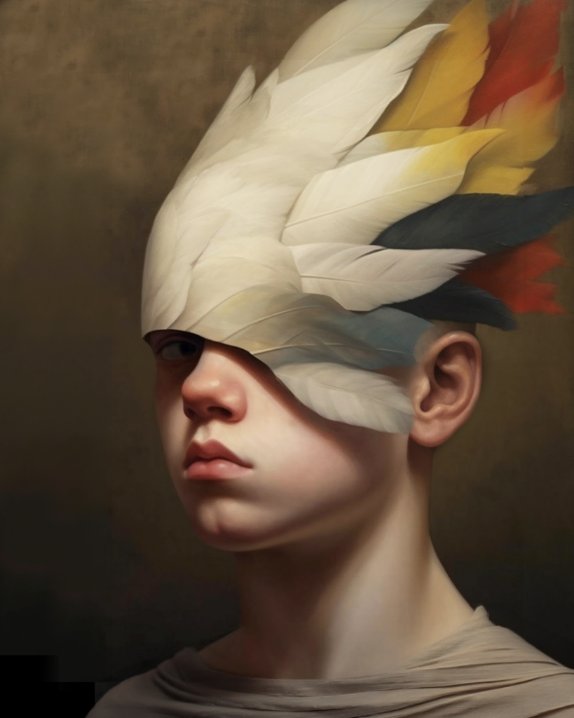 This portrait of Perdix sporting a feathered helmet was my attempt to merge a partridge and cockatoo. I deliberately made him look as skeptical about this imposed hybridity as I feel painting it.