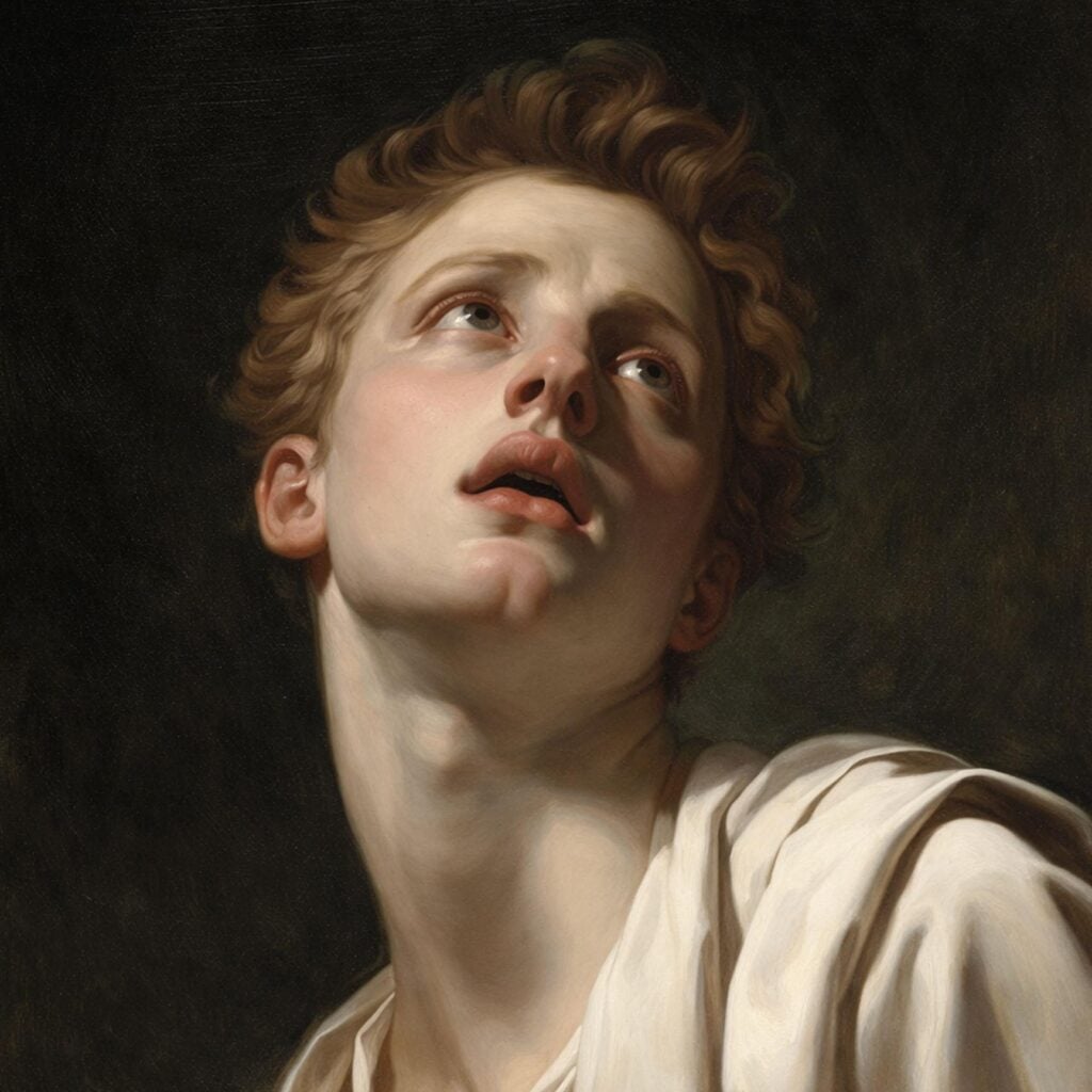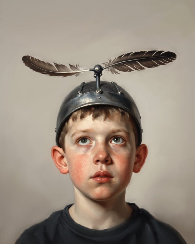 For some reason, this made me want to paint Icarus as a kind of Norman Rockwell–esque schoolboy, his head crowned by a thinking cap topped by two spinning feathers.