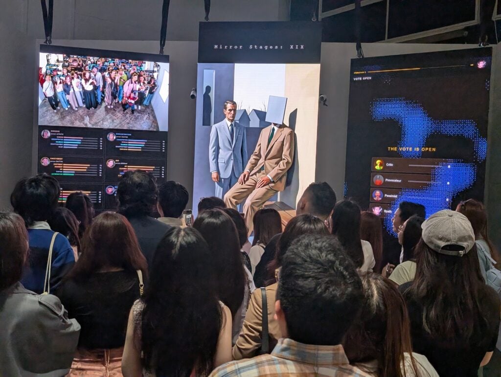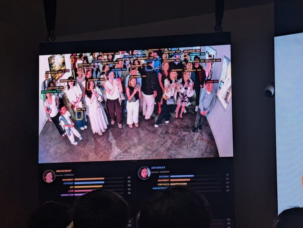 Botto was also on display in a special installation, performing in real time scanning the audience through a camera and using attendees’ emotional responses and gestures to create fictional characters to inform the art it was creating, co-lead of Botto Simon Hudson said. This was the first time Botto used data from a live audience in its creative pipeline, where Botto’s art is typically guided by votes and comments from an online community.