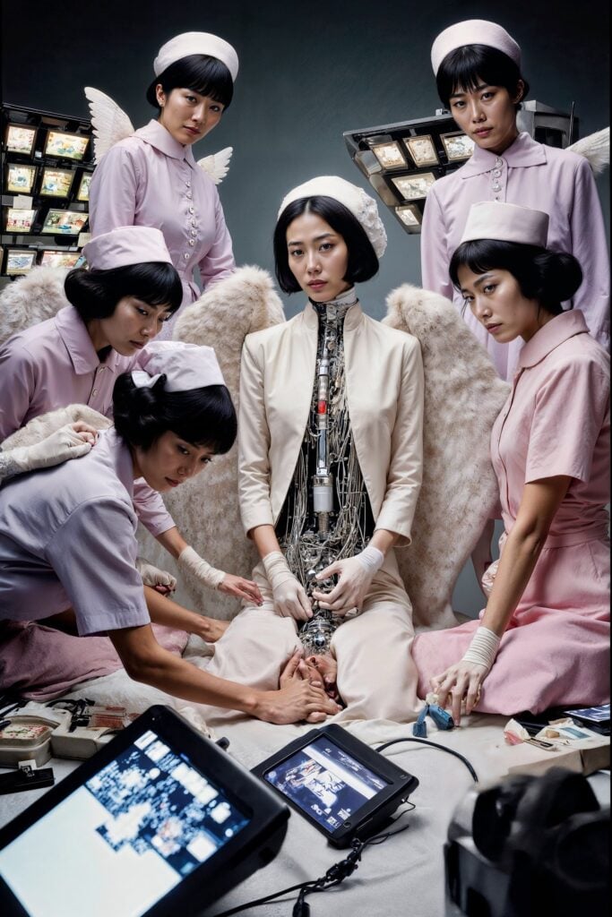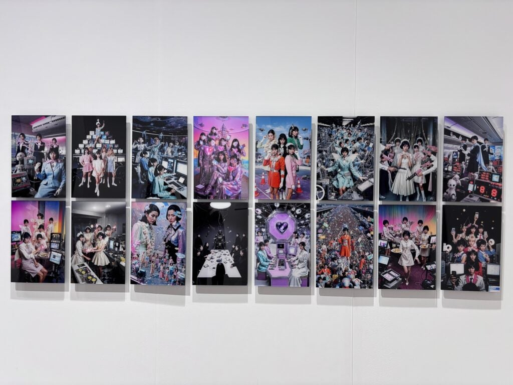 Kusano showcased her sculpture, video and photo collection “Ornament Survival” in which she used AI to create multiples of herself as a variety of characters. In the video, six of Kusano in colorful blazers and headsets multiply into an army of fashioned blondes, and then morph again into dozens of waitresses in orange dresses hustling trays of food.